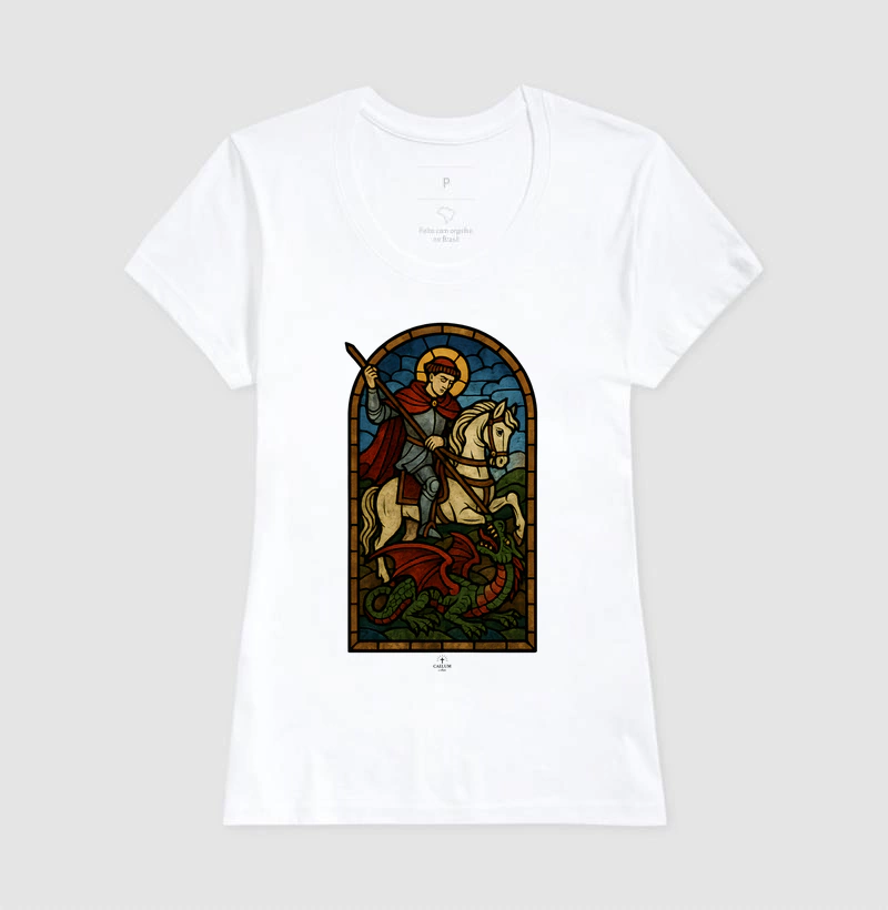 Esta camiseta traz a imponente imagem de São Jorge em estilo vitral, representando o santo guerreiro que, montado em seu cavalo branco, derrota o dragão — símbolo do mal. Uma arte marcante e devocional, que traduz a luta diária do cristão pela verdade, pela justiça e pela fidelidade a Deus.